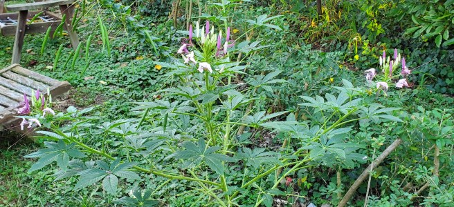I am with you on the cutting back of hedges, I do not have hedges just some woods that encroach when I turn my back. The tall plant with the spidery pink flower is a cleome (aka a spider flower) these self seed like crazy, each one of those little green spiky things is filled with tons of seeds. Keep in mind if you can see your neighbors they can see you!